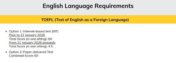 本科托福要求:2026年1月21日及之后参加的托福考试,要求总分最低为4.5分。