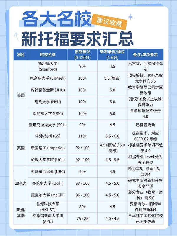 以上公布新托福要求的院校中,最低分数门槛均为4.5分(处于相对低位)。然而,门槛低并不代表录取容易。若目标锁定斯坦福等顶尖名校,建议以显著高于官方最低要求的分数进行准备,才能在激烈竞争中凸显优势。
