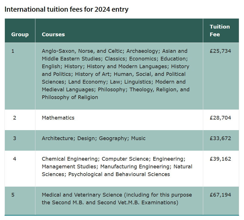 2024/25学年,剑桥大学的学费约在£24,789-£69,000之间。
