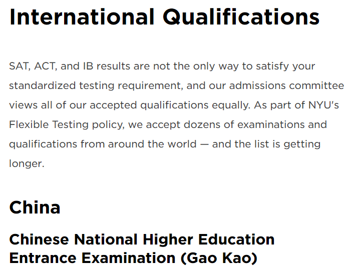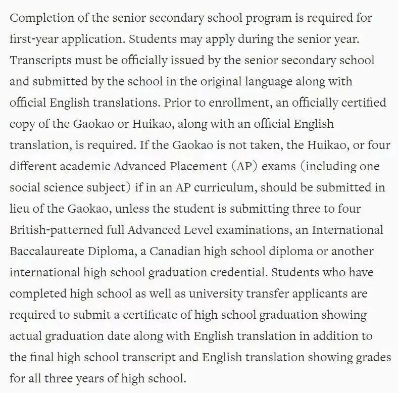 纽约大学作为一所全球顶尖的私立研究型大学,也开始接受中国学生提交高考成绩进行申请。非国际体系普高生的高考成绩需要由高中母校核实并提交。